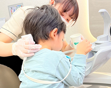 むし歯の治療のときだけに、歯医者に連れていくと、子どもは「歯医者は痛いことをされる場所だ」と感じ歯医者が怖くなります。しかし、当園では月に2回前後、当法人の歯科医院でお子さまに実際にチェアに座っていただいてむし歯健診やフッ素塗布などを行っており、歯医者のチェアに座り慣れているお子さまが殆どです。